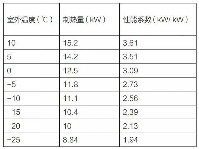 空氣源熱泵機組做采暖的熱源設備,與采暖系統的耗電量有關的主要是制熱量和性能系數兩個參數。我們以一款5HP低溫變頻機的性能參數(含水泵)為例來說明,出水溫度按41℃計算,表2是該機器的采暖全工況的性能參數表。