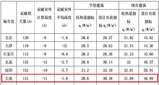 根據《全國主要城市采暖期耗熱量指標和采暖設計熱負荷指標》,大連市中山區節能建筑每平方米采暖季供暖所需熱能為20.6w/㎡*24h*131d/1000=64.77kwh/㎡