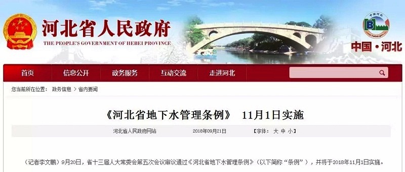 9月20日,《河北省地下水管理?xiàng)l例》在河北省第十三屆人民代表大會(huì)常務(wù)委員會(huì)第五次會(huì)議上獲高票通過,將于2018年11月1日實(shí)施。《條例》規(guī)定: