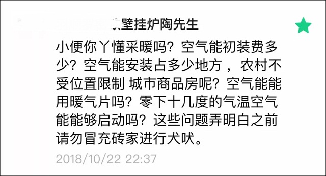 昨天發(fā)了一篇計算熱泵采暖費用的文章,一個做壁掛爐的大哥不高興了,出口成臟:“小便你丫懂采暖嗎?空氣能初裝費多少?空氣能安裝占多少地方?農(nóng)村不受位置限制城市商品房昵?空氣能能用暖氣片嗎?零下十幾度的氣溫空氣能能夠啟動嗎?這些問題弄明白之前請勿冒充磚家進(jìn)行犬吠。”雖然說,競品之間攻擊很正常,但是他問的問題挺有意思的,想必大家在銷售中也經(jīng)常遇到,所以我們索性公開解答一下,以正視聽。