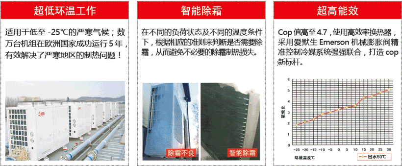 超低溫空氣源熱泵優缺點二:熱效率COP達3.0以上高效節能最高可達75%,相同一度電可創造三至四度電的熱能